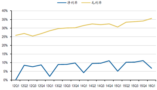 2012-2016年中國上市電梯公司毛利率和凈利率