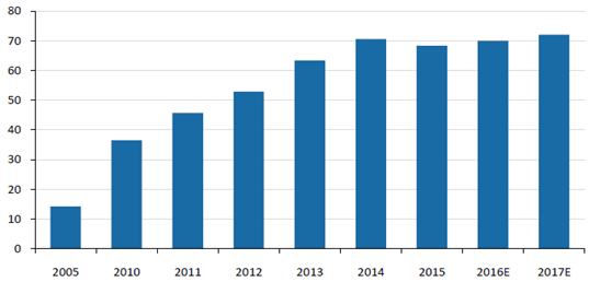 2005-2017年國內(nèi)電梯歷年銷量情況及預(yù)測(cè)(萬臺(tái))