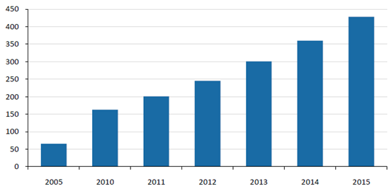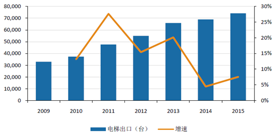 過去十年,中國電梯出口量一直保持較快增長(zhǎng),2011-2013年是我國電梯出口增速最快的三年,出口量增長(zhǎng)率分別達(dá)到27.64%、15.43%以及20.12%,進(jìn)入2014及2015,電梯出口量逐漸步入平穩(wěn)增長(zhǎng)階段,,分別保持4.46%、7.53%的年增長(zhǎng)率,2015年電梯出口達(dá)到新高,合計(jì)71,666臺(tái)。相比國內(nèi)市場(chǎng),海外市場(chǎng)的空間和增速都更大。