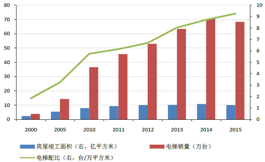 從滲透率角度看,我國2015年電梯人均保有量約為32.2臺(tái)/萬人,僅僅為日本的1/6,德國的1/4,與城鎮(zhèn)化率較高的歐美發(fā)達(dá)國家相比,仍有很大差距。基于這一事實(shí),隨著新型城鎮(zhèn)化的發(fā)展,電梯作為新型城鎮(zhèn)化發(fā)展的主要配套硬件之一,未來需求不會(huì)減弱。2015年雖然電梯整機(jī)銷量略有下滑,但電梯配比指標(biāo)創(chuàng)出新高,達(dá)到9.3臺(tái)/萬平。長(zhǎng)期來看,我國電梯配比在未來仍將處于提升階段,這也是電梯銷量能夠保持高位平穩(wěn)發(fā)展的主要因素之一。