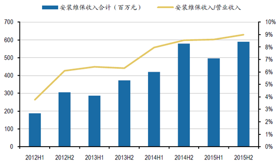 2012-2015年上市電梯企業(yè)維保收入整體占比