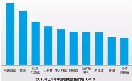 從出口目的地來看,馬來西亞、新加坡、泰國、韓國、印度等東南亞是中國電梯產(chǎn)品的主要需求國。其次,土耳其、澳大利亞、沙特阿拉伯、阿聯(lián)酋、俄羅斯也是主要需求國。