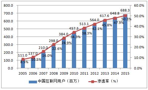 2005-2015年中國互聯(lián)網(wǎng)用戶及滲透率