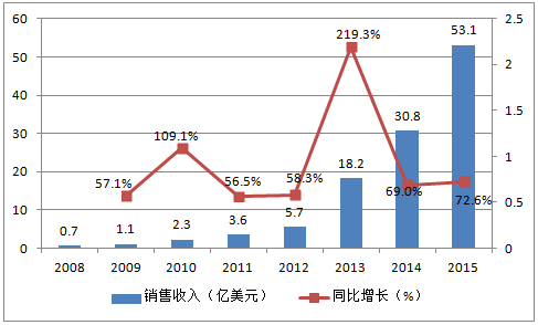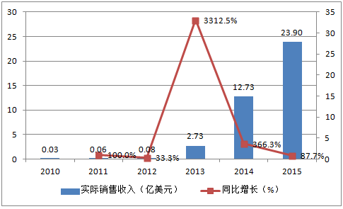 2010-2015年中國自主研發(fā)移動游戲海外市場實際銷售收入及增速