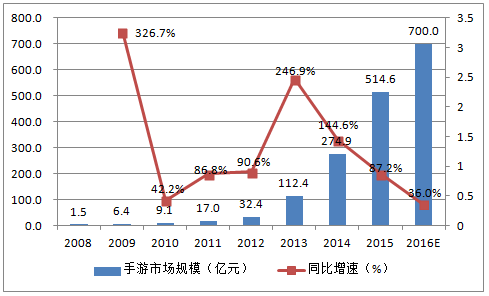 2008-2016年中國手游市場規(guī)模及增速