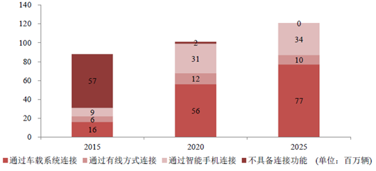 2015-2025 年新售汽車不同聯(lián)網(wǎng)方式的規(guī)模情況