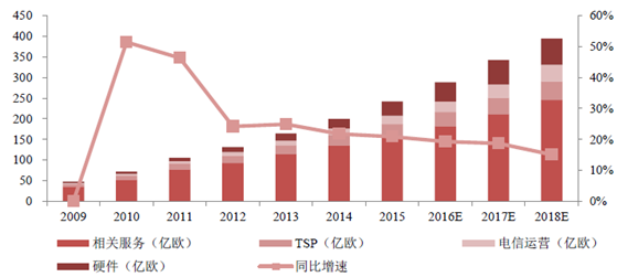 跟蹤國內(nèi)汽車歷年保有量、銷量數(shù)據(jù),假設(shè)2016-2020 報廢率由5%逐年上升至7%、銷量增速由4.5%下降至4%,推算出2020 年國內(nèi)汽車保有量由2015 年的1.7億輛上升至2.5 億輛,車聯(lián)網(wǎng)滲透率可達(dá)到20%,對應(yīng)5000 萬輛汽車,按照平均每輛車5000元的花費(包括硬件、TSP、電信運營、相關(guān)服務(wù)),市場規(guī)模將達(dá)到2500 億元,其中硬件、TSP 分別為400 億元、300 億元。
