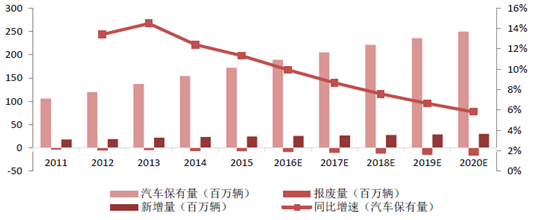 2016-2020 中國汽車保有量、新增量、報廢量預(yù)測