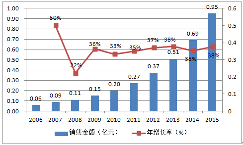 2006-2015年中國專業潛水培訓市場規模及年增長率