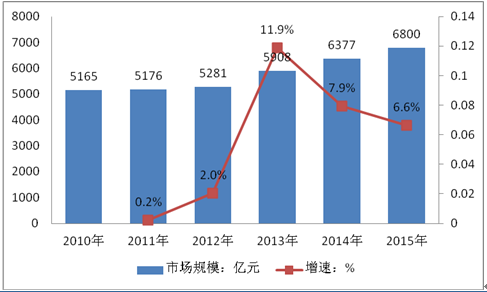 2010-2015年汽車沖壓件行業市場規模及增長率:億元,%