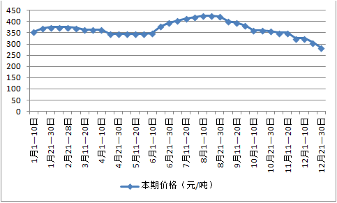 2015年中國(guó)硫酸價(jià)格波動(dòng)較大,8月上中旬硫酸價(jià)格達(dá)到最高值425元/噸,而后開始逐步下降,12月下旬硫酸價(jià)格達(dá)到最低值282.5元/噸。預(yù)計(jì)2016年中國(guó)硫酸價(jià)格暫時(shí)不會(huì)大幅上漲。