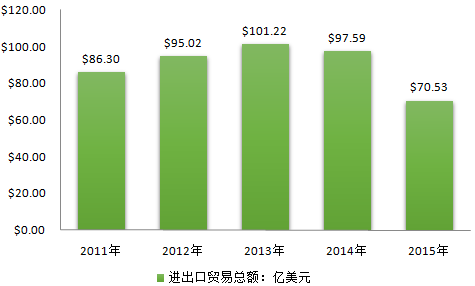 年份進(jìn)口額:美元出口額:美元2015$3,356,898,759$3,695,623,0702014$4,631,013,678$5,128,001,3622013$4,779,737,840$5,342,645,1992012$4,520,137,377$4,982,009,7442011$4,108,175,107$4,521,689,640資料來源:聯(lián)合國數(shù)據(jù)統(tǒng)計(jì)庫