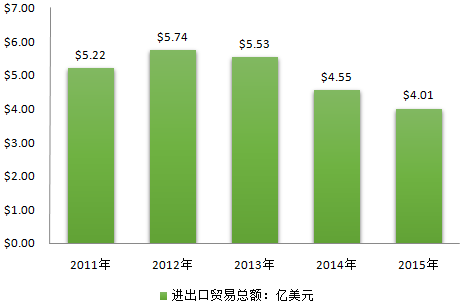 年份進口額:美元出口額:美元2015$161,167,872$239,422,5862014$211,100,239$244,299,1382013$226,488,448$326,593,3252012$237,612,916$336,473,1472011$221,093,615$300,567,140資料來源:聯合國數據統計庫