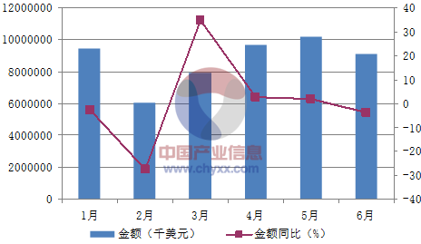 月份金額(千美元)金額同比(%)1月9449970-2.72月6083063-27.53月792282234.94月96634252.65月102050351.76月9114298-3.7數據來源:中國海關,中經先略數據中心整理