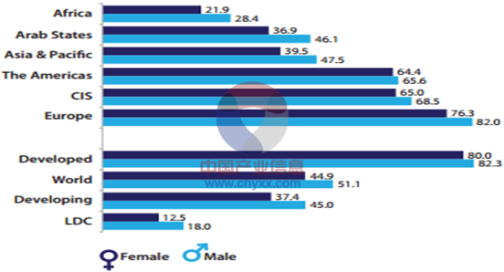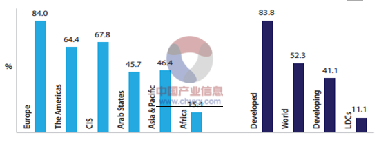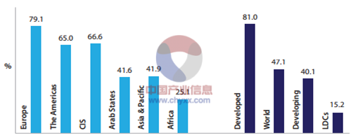 全球接近1/2的人口使用互聯(lián)網(wǎng),但在最不發(fā)達(dá)國家使用互聯(lián)網(wǎng)的人口僅占1/7。
