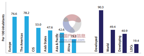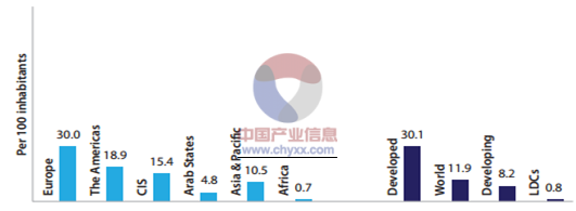 2015年非洲及不發(fā)達(dá)國家固定寬帶普及率仍小于1%。近年來,中國固定寬帶普及率迅猛增長,是亞太地區(qū)主要增長點,到2016年底,亞太地區(qū)固定寬帶普及率有望超過10%。