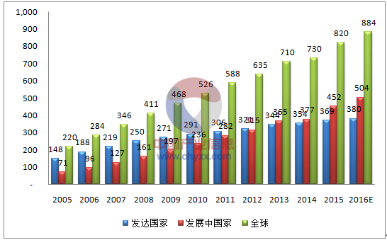 2006-2016年全球不同經(jīng)濟體固定寬帶接入數(shù)量(百萬戶)
