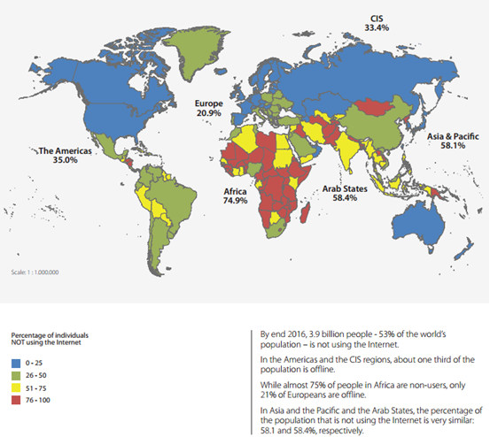 到2016年底全球有53%的人口沒有接觸過互聯(lián)網(wǎng)