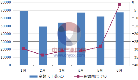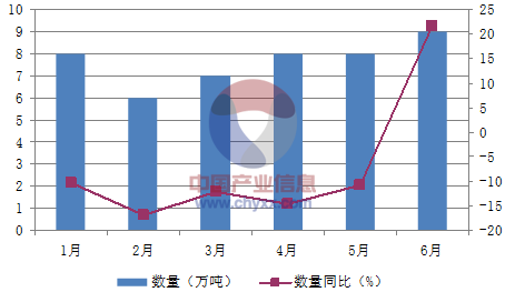 月份數量(萬噸)金額(千美元)數量同比(%)金額同比(%)1月869,195-10.4-29.72月648,963-16.9-33.73月754,023-12.1-31.14月866,608-14.5-31.25月861,814-10.7-28.36月967,07721.6-1.6數據來源:中國海關,中經先略數據中心整理