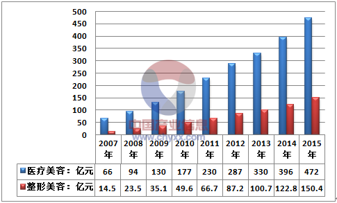 2007-2015年我國醫療美容及整形美容行業市場規模情況