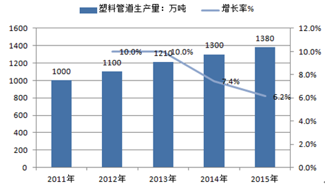面對復雜嚴峻的國內外經濟環境,在國內經濟下行壓力持續加大、房地產市場低迷等多重困難背景下,2015年,塑料管道行業快速發展勢頭繼續放緩,增幅略有下降。但在國家相關市政工程、水利工程、農業、工業和建筑業等行業市場需求引領下,塑料管道行業取得了一定的增長。至2015年底,全國塑料管道生產量為1380萬噸,增長率為6.15%。2011-2015年全國塑料管道生產量