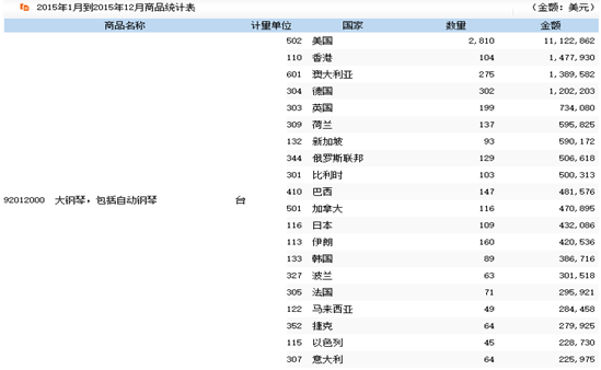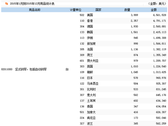 2015年主要貿易國鋼琴進出口情況分析