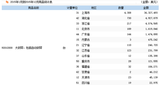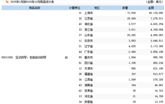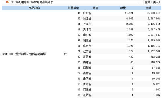 2015年主要省市鋼琴進出口情況分析