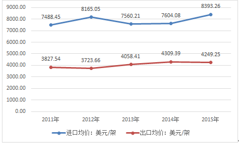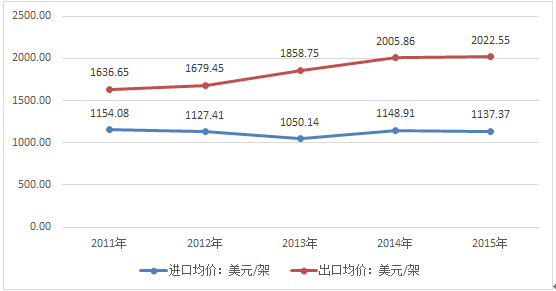 2011-2015年我國鋼琴產品進出口均價走勢圖