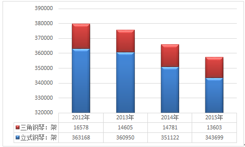 核心提示:經中國樂器協會行業統計,2015年,國內鋼琴產量共計357302架,同比減少2.35%。其中立式鋼琴343699架,同比減少2.11%;三角鋼琴13603架,同比減少7.97%。鋼琴產銷量仍然高居世界首位,占世界鋼琴總產量70%以上。201經中國樂器協會行業統計,2015年,國內鋼琴產量共計357302架,同比減少2.35%。其中立式鋼琴343699架,同比減少2.11%;三角鋼琴13603架,同比減少7.97%。鋼琴產銷量仍然高居世界首位,占世界鋼琴總產量70%以上。