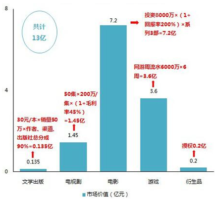 與此同時或在此之后,A級IP將開發游戲版本,商業變現持續推進,以網游平均流水6000萬和6周時間來算,大概產生3.6億流水;另外,A級IP對外授權進行衍生品開發,預估授權金額為0.2億。總體而言,A級IP經由文學出版、電視劇、電影、游戲、衍生品的運營、改造和變現,將實現近13億的市場價值,由此可見,A級IP的商業價值和泛娛樂產業鏈的開發價值表現突出。