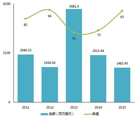 2011-2015年傳媒企業VC/PE融資金額及數量