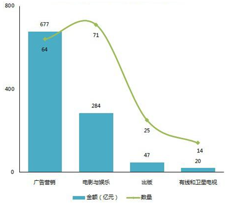 其中,廣告營銷領域全年并購交易金額在所有領域中最高,主要是由于中概股分眾傳媒借殼七喜控股上市,涉及交易金額457億。電影與娛樂行業并購數量最高,為71起,總金額達到284億元,平均每起4億元。電影與娛樂行業發生并購事件繁多,主要是由于電影市場在2015年繼續保持井噴增長態勢,電影票房升至440億元,并且成長速度上漲至49%;此外,中概股游戲公司加入回歸A股浪潮。從行業特性來看,電影與娛樂屬于輕資產、人才和創意為重的領域,因而所需并購金額相對較少,有利于上市公司跨界進入,實現業務轉型。另外,電影與娛樂領域處于泛娛樂產業的中心地帶,其市場影響力和IP價值放大效益顯著,從而也成為了投資機構和傳統公司爭相追捧的對象。