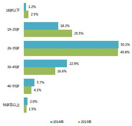 近半的游戲用戶年齡多為26-35歲;相比于2013年,游戲用戶在2014年有著逐步高齡化的趨勢,36-45歲年齡段游戲用戶增加6.3個百分點,46-55歲的游戲用戶也增加了1.6個百分點。除了主力開發年輕成年用戶喜歡的游戲產品之外,游戲廠商也需要針對高齡化的趨勢,預先進行市場調研工作,以開辟新的玩家市場。