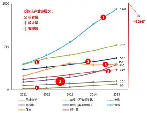 2011-2015年,泛娛樂的核心產業均處于長線上升情勢之中,總產值由1888億元增加至4229億元,復合增長率達22.34%。