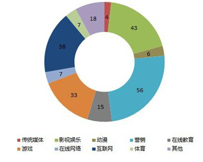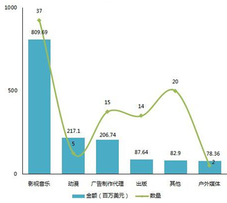 從2015年傳媒行業VC/PE融資分布來看,影視音樂以8.1億美元融資金額、37起數量雙雙排名第一,其次是5起來自動漫領域的2.2億美元融資。具體案例包括:阿里創投和平安資產3.6億美元參與華誼兄弟定增,天神娛樂文創基金13.23億元投資儒意影業,朱雀投資和泰康資產7.5億元投資華策影視,雙子投資1.12億美元入股春天融合。