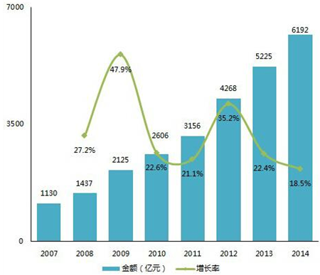 2014年,中國文化娛樂產業固定資產投資完成規模突破6000億元大關,總體達到6192億元,相比2013年增加967億元,上升幅度為18.5%,景氣指數依舊表現亮眼。