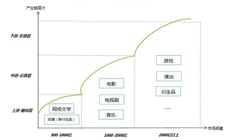 其中網絡文學、動漫(不含衍生品)為上游孵化層,電影、電視劇、音樂為中游運營層,游戲、演出、衍生品等為下游變現層。
