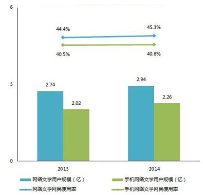 2014年網絡文學擁有2.94億用戶,同比增長7.3%;手機網絡文學擁有2.26億用戶,同比增長11.9%,用戶數量增幅快于PC端。