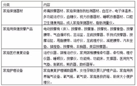 我國家用醫(yī)療器械主要分為四大類:家庭保健器材、家庭用保健按摩產(chǎn)品、家庭醫(yī)療康復(fù)設(shè)備以及家庭護理設(shè)備。