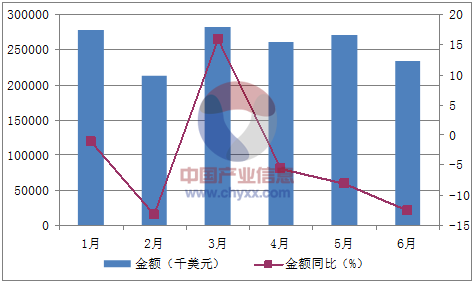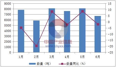 核心提示:智研咨詢數據顯示:2016年1-6月中國抗菌素 (制劑除外)出口數量為44,194噸,同比下降1.9%;2016年1-6月中國抗菌素 (制劑除外)出口金額為1,534,977千美元,同比下降4.4%。2016年1-6月中國抗菌素 (制劑除外中經先略數據中心數據顯示:2016年1-6月中國抗菌素 (制劑除外)出口數量為44,194噸,同比下降1.9%;2016年1-6月中國抗菌素 (制劑除外)出口金額為1,534,977千美元,同比下降4.4%。2016年1-6月中國抗菌素 (制劑除外)出口量統計表如下表所示:2016年1-6月中國抗菌素 (制劑除外)出口量統計表月份數量(噸)金額(千美元)數量同比(%)金額同比(%)1月7,847277,600-4.7-1.22月5,840211,838-19.9-13.23月8,093281,2208.415.94月7,595260,587-2.1-5.65月8,112270,3508.6-8.16月6,707233,865-1.9-12.6數據來源:中國海關,中經先略數據中心整理2016年1-6月中國抗菌素 (制劑除外)出口數量統計圖