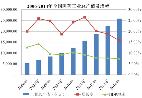 2006-2014全國(guó)醫(yī)藥工業(yè)總產(chǎn)值及增幅