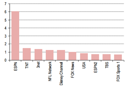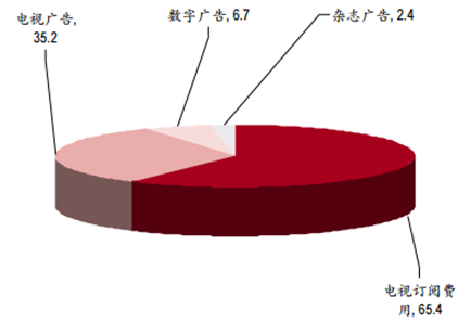 龐大的付費(fèi)群體和較高的訂閱費(fèi)用支撐起媒體巨額轉(zhuǎn)播費(fèi)。美國(guó)的體育轉(zhuǎn)播 渠道以 ESPN、Fox、NBC 等傳統(tǒng)電視臺(tái)為主,采用付費(fèi)訂閱模式,觀眾為收看 體育比賽買單,如 ESPN 在全美擁有 9,000 萬(wàn)左右的家庭付費(fèi)用戶,美國(guó)每個(gè) 電視用戶每月支付 45 美元的訂閱費(fèi),其中有 6.04 美元支付給 ESPN,遠(yuǎn)超過其 他頻道,2013 年 ESPN 年總收入為 109.75 億美元,EBITDA 為 39 億美元,其中 電視訂閱費(fèi)收入占比 60%,剩下 40%來(lái)自廣告業(yè)務(wù)。英超比賽在英國(guó)的收費(fèi)則 更加昂貴,一個(gè)英國(guó)球迷如果不想錯(cuò)過當(dāng)?shù)貎杉译娨暸_(tái)的直播,一個(gè)賽季大 約需要花費(fèi) 1,100 英鎊。