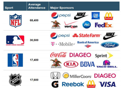 廣告贊助是體育 IP 變現(xiàn)的重要方式,贊助商多為消費(fèi)品或金融公司。企業(yè)知 名度每提高 1%,需要投入 2,000 萬(wàn)美元的廣告費(fèi),但是借助大型體育賽事, 營(yíng)銷效果可以提高 10%。2015 年北美贊助市場(chǎng)規(guī)模超過 210 億美元,相當(dāng)于三 分之一的電視廣告市場(chǎng)規(guī)模或一半的數(shù)字廣告市場(chǎng)規(guī)模,其中 70%的贊助資金 流向體育,相比于企業(yè)在廣告營(yíng)銷投入上的增加,近些年贊助花費(fèi)增速明顯 更快。2013 至 2014 賽季,NBA 聯(lián)盟及 30 家俱樂部的總贊助收入高達(dá) 6.79 億美 元,贊助商主要來(lái)自汽車、保險(xiǎn)、啤酒、銀行、通信等行業(yè)。