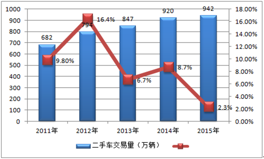 2015年全國二手車累計交易量達到941.71萬輛,相比2014年增長2.32%,累計交易金額5535.4億元。