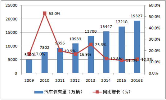 2009-2015年中國汽車保有量及增速