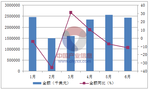 月份數(shù)量(萬(wàn)噸)金額(千美元)數(shù)量同比(%)金額同比(%)1月252,468,256-4.5-4.22月161,496,185-30.6-35.93月171,605,02631.630.84月262,349,35810.810.35月292,562,8181-76月262,436,431-3.4-11.8數(shù)據(jù)來(lái)源:中國(guó)海關(guān),中經(jīng)先略數(shù)據(jù)中心整理