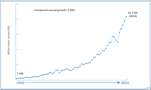 1950-2014年全球不銹鋼產(chǎn)量走勢圖