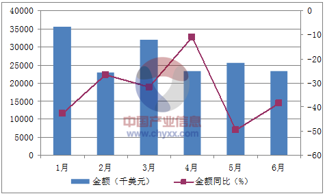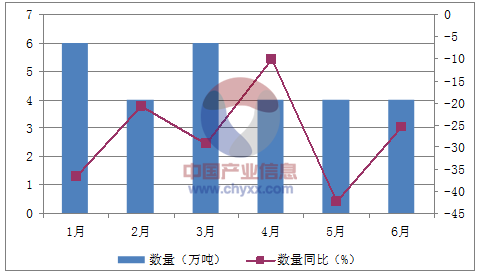 月份數量(萬噸)金額(千美元)數量同比(%)金額同比(%)1月635,463-36.7-42.72月422,888-20.6-26.53月631,794-29.2-31.74月423,131-10.2-115月425,512-42.4-49.56月423,237-25.4-38.4數據來源:中國海關,中經先略數據中心整理