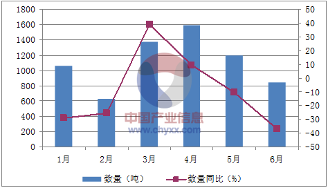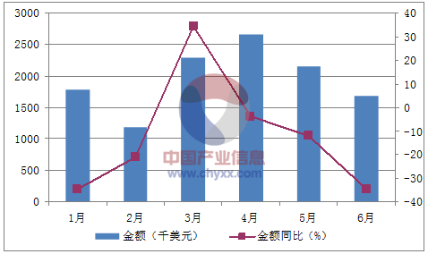 月份數量(噸)金額(千美元)數量同比(%)金額同比(%)1月1,0631,777-28.8-34.72月6261,194-25.7-21.13月1,3762,2993934.24月1,5972,6589.3-3.95月1,1932,154-10.7-126月8431,690-37.1-34.8數據來源:中國海關,中經先略數據中心整理