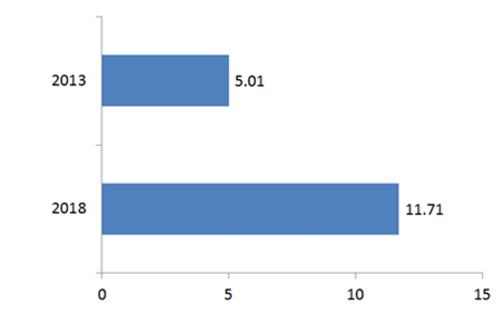 LED原材料市場2013年的市場規(guī)模達到50.1億美元的銷售額,到了2018年,將可達117.1億美元,也就是這五年之間的市場規(guī)模要翻兩倍之多。